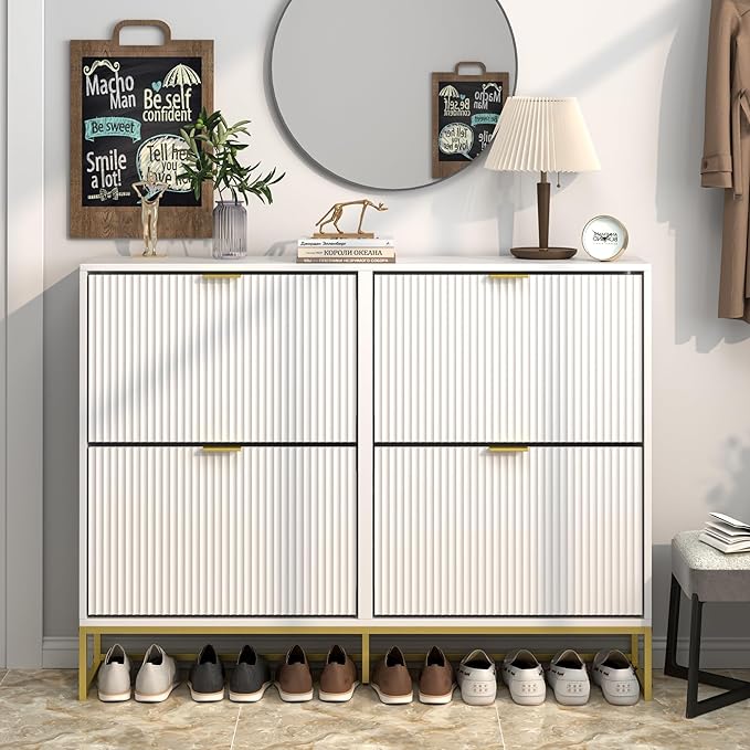 Moderne, vrijstaande schoenenkast voor in de hal, ontworpen om ruimte te besparen dankzij het innovatieve ontwerp met kantelbare lades die zorgen voor gemakkelijke toegang en een stofvrije opbergoplossing. Dit elegante meubelstuk heeft een stijlvolle afwerking in geribbeld hout en is voorzien van vier kantelbare lades, stevige metalen handgrepen en robuuste metalen voetjes, die een vleugje elegantie toevoegen aan uw interieur en uw hal netjes houden.