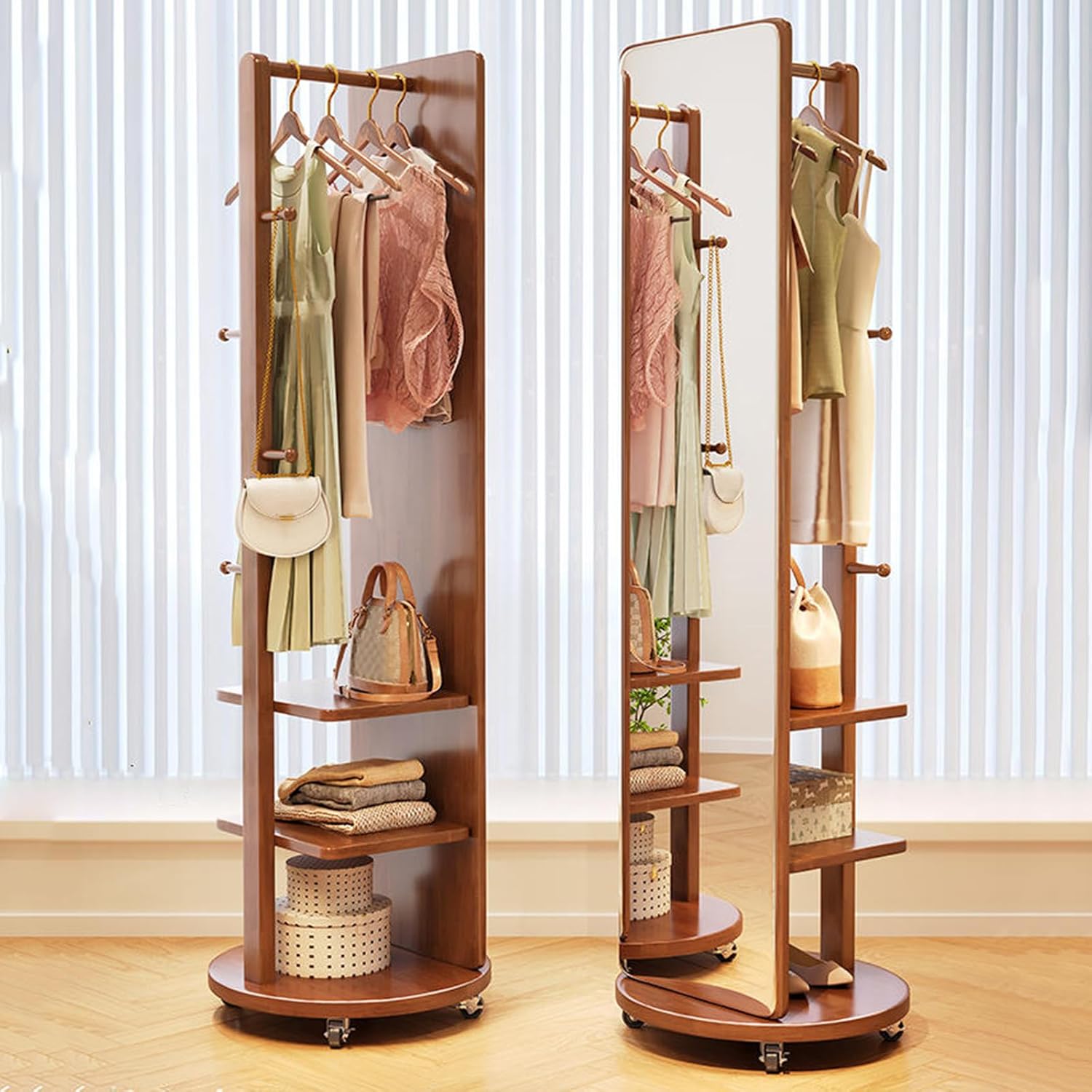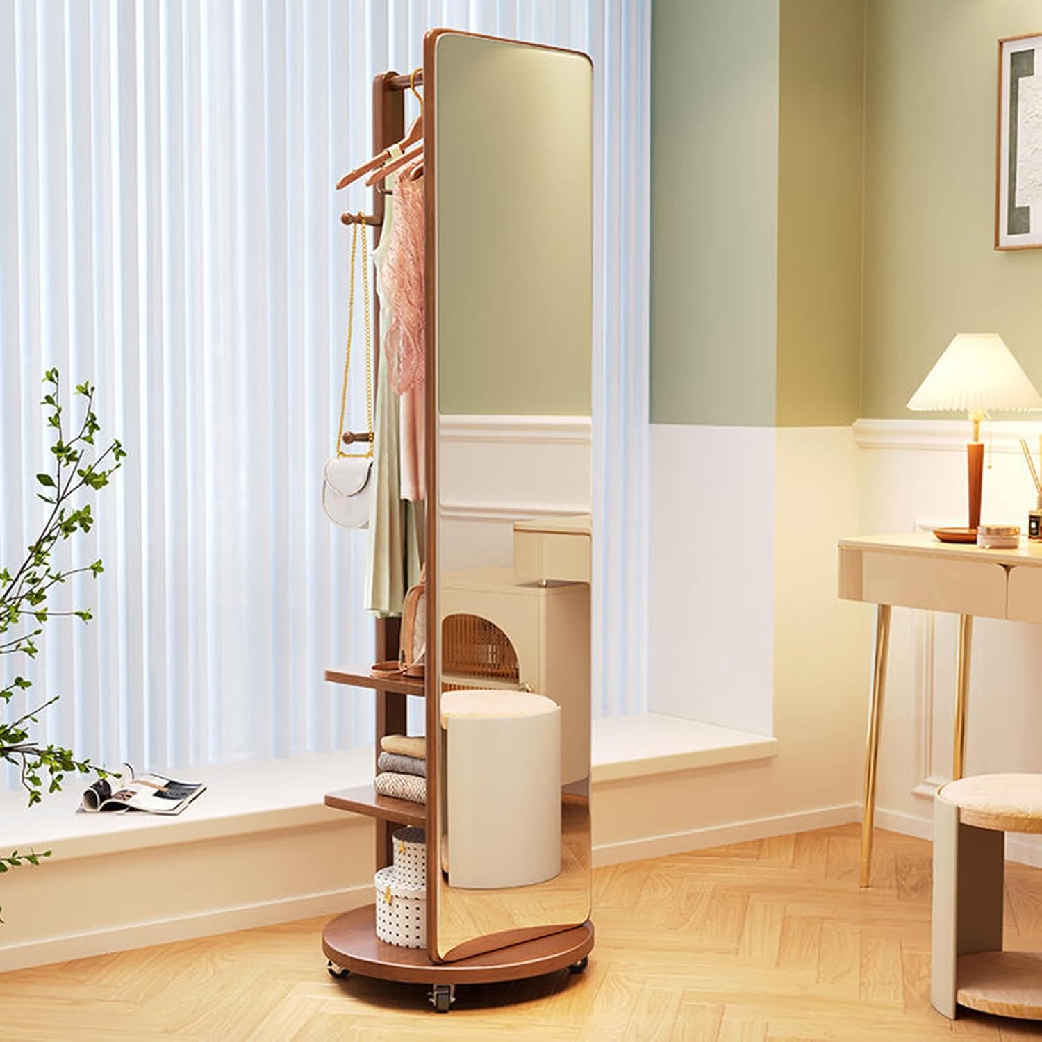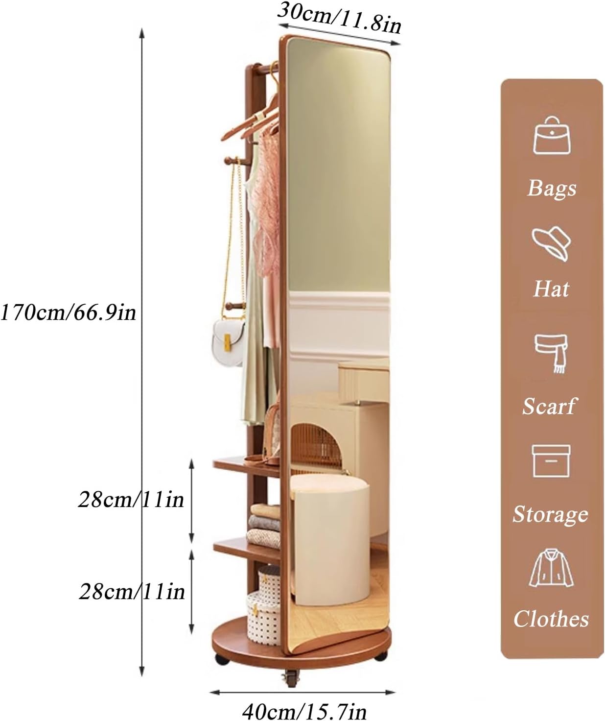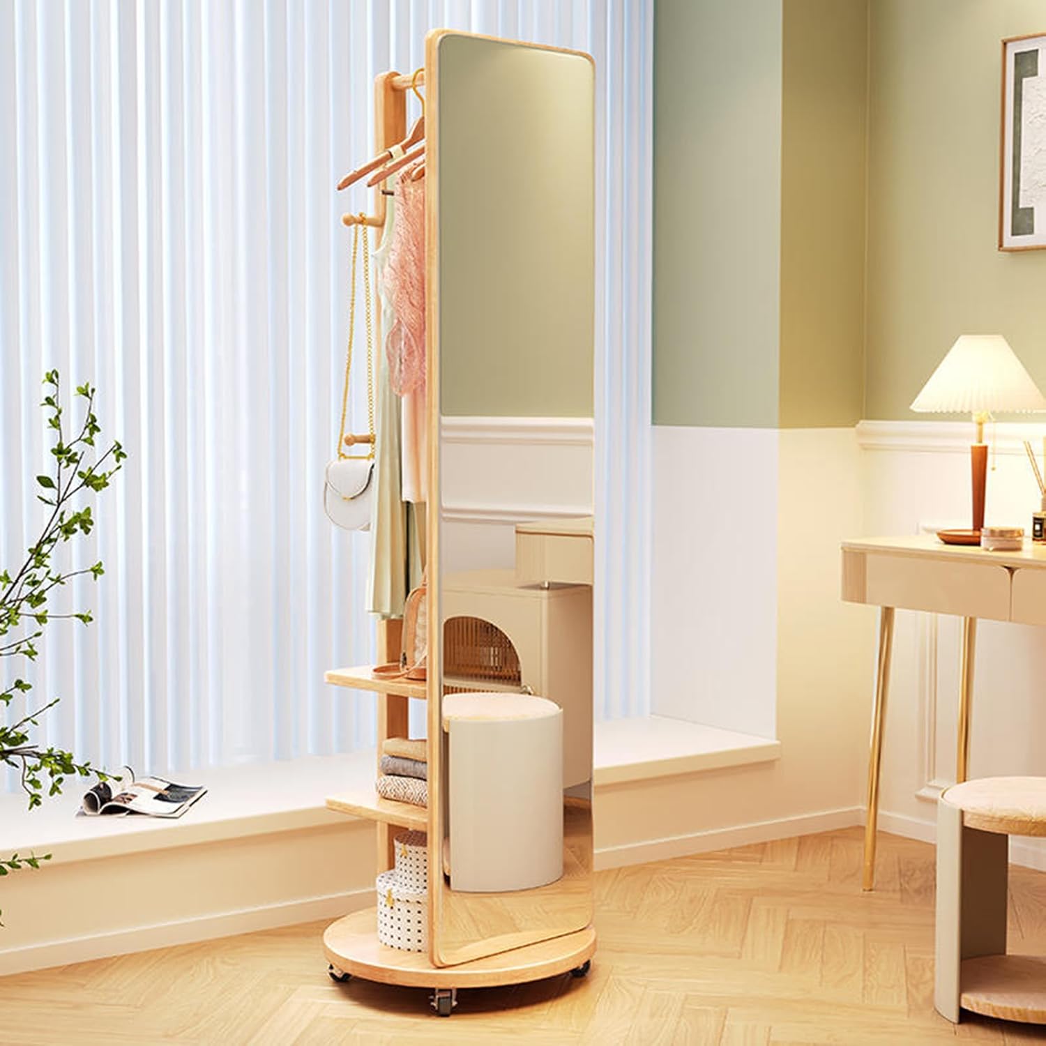 Gemaakt van massief hout, is hij stabiel en veilig, met een high-definition, breukvaste spiegel om het hele gezin te beschermen. Hij neemt slechts 0,2 m² in beslag, maar biedt veel opbergruimte: een massief houten kledingrek, haken aan de achterkant voor hoeden en accessoires, en drie planken voor tassen, dekens of opgevouwen kleding.