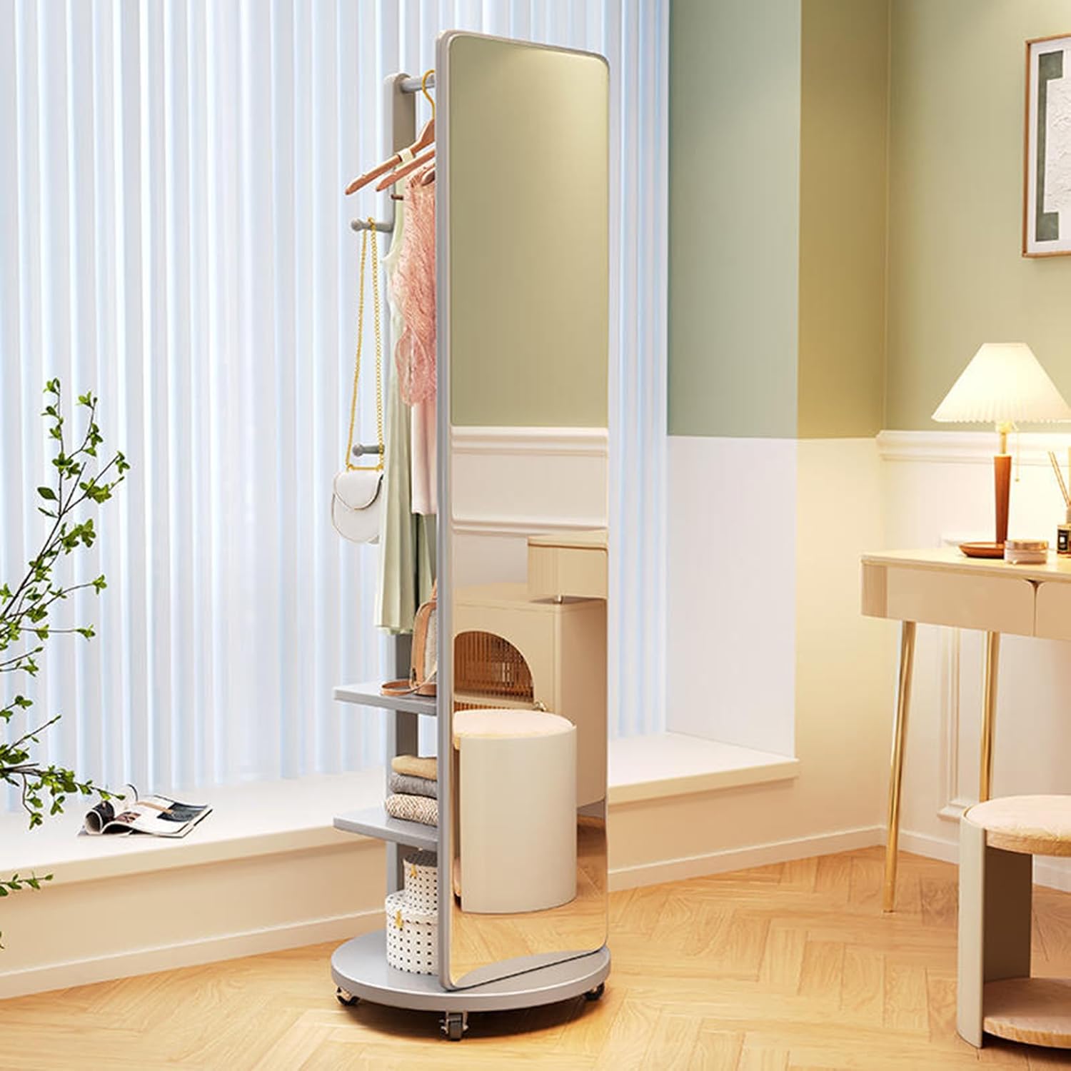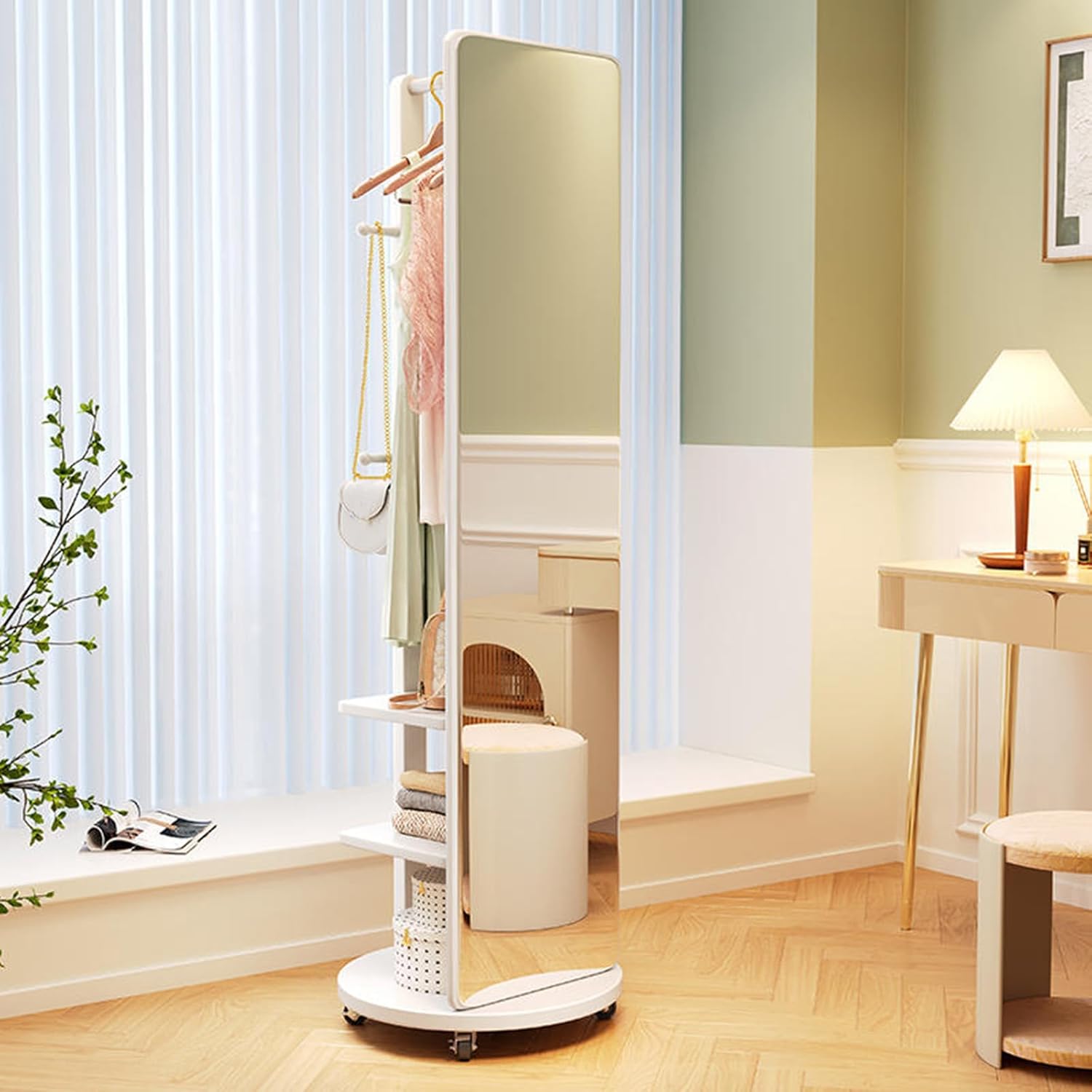 De spiegel aan de voorkant is volledig verstelbaar, zodat u op elk moment uw look kunt bewonderen. Aan de achterkant kunt u kleding en tassen ophangen aan een kapstok, terwijl de planken met meerdere niveaus ruimte bieden voor verschillende spullen. Door het grote spiegeloppervlak kunt u uw hele outfit van top tot teen zien, waardoor de ruimte visueel wordt vergroot.